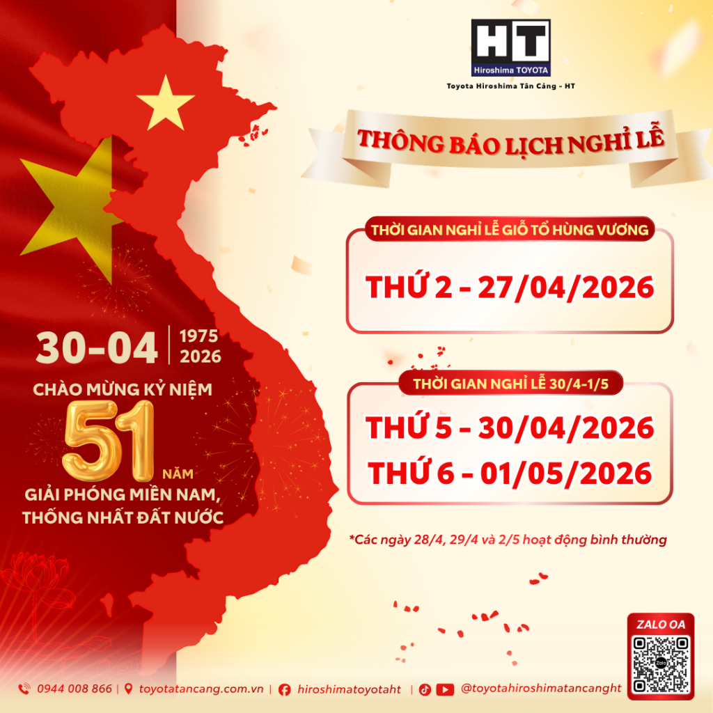 Toyota Hiroshima Tân Cảng – HT xin thông báo đến Quý Khách hàng, Quý Đối tác lịch nghỉ lễ như sau: Giỗ Tổ Hùng Vương (10/3 ÂL) ⏰Thời gian nghỉ lễ: Thứ 2 ngày 27/04/2026...